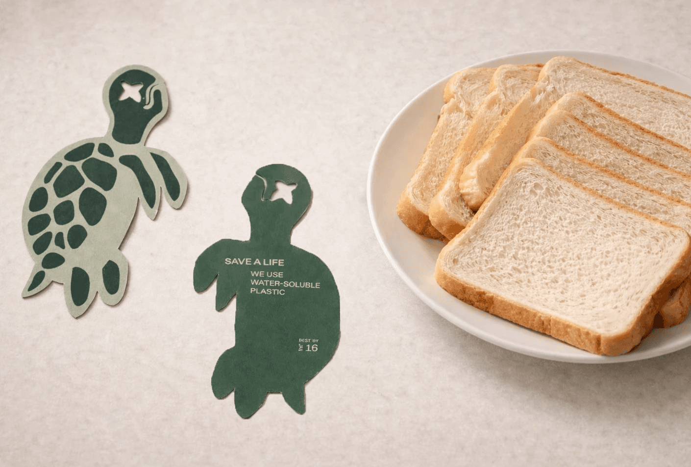 I used a hanging turtle illustration to confront plastic pollution while promoting responsible materials. The cross shaped eyes symbolize death and also function as the bread bag securing hole, while the narrowed neck guides users to wrap the plastic and references how marine animals are harmed by waste. I removed front facing text to create an immediate emotional impact through graphic storytelling. By choosing illustration over photography, I keep the message powerful but appropriate for a public setting. The back provided the solution by explaining the use of water soluble plastic for packaging. It balanced awareness with reassurance and showing how both brands and consumers can take part in environmental action.