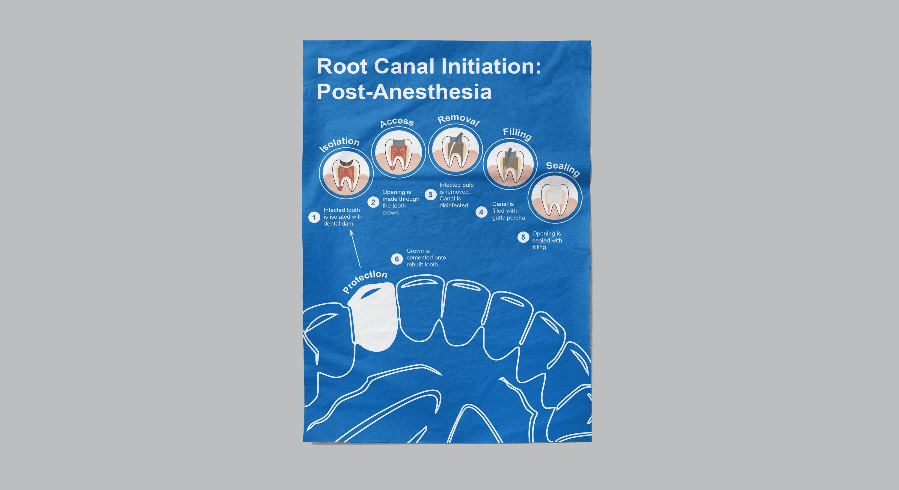 This infographic was designed for both dental professionals and patients, so I prioritized clarity through simple visuals and straightforward step titles. I highlighted the treated tooth with a filled color to represent the crown and reflect how root canal teeth appear white on real x-rays due to filling materials. The step by step graphics use circular forms that align with the tooth icons, creating a consistent ratio and parallel structure throughout the layout. A health associated blue color and clean Arial sans serif typography also support readability and a clean, modern look that I aim for.
