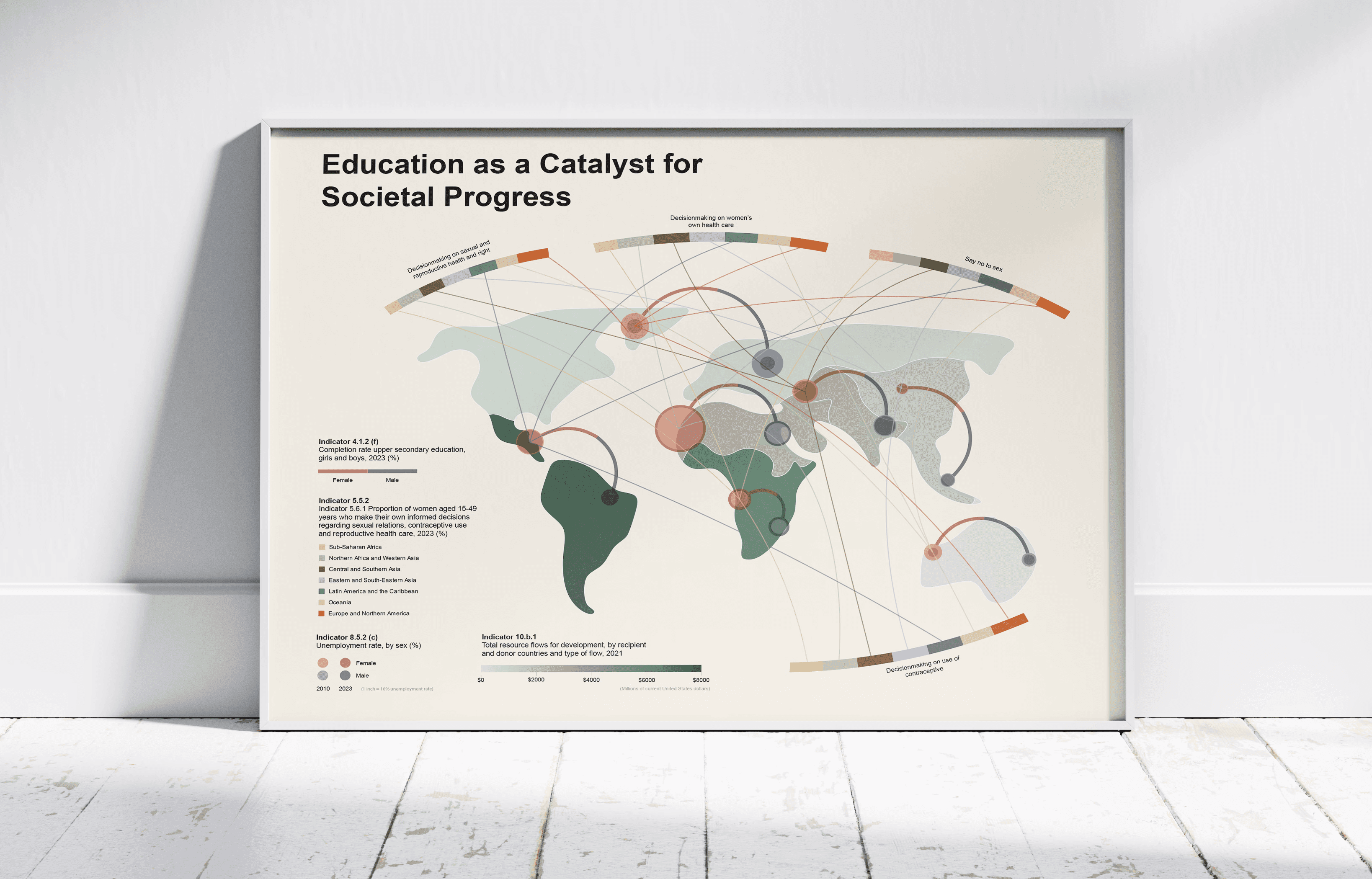 It maps the relationship between education, gender equality, and economic outcomes across global regions. Using UN Sustainable Development Goal indicators, I designed an infographic that combines choropleth mapping, bubble charts, and stacked column charts to reveal disparities in women’s autonomy, unemployment by sex, and international resource flows. The design was created for both general audiences and development focused readers, prioritizing visual clarity over dense statistics. I used culturally neutral earth tones for comfort and global relevance, paired with clean Arial typography for readability. Curved connection lines also transform the data into a flow map, emphasizing how education acts as a bridge linking social and economic outcomes worldwide.